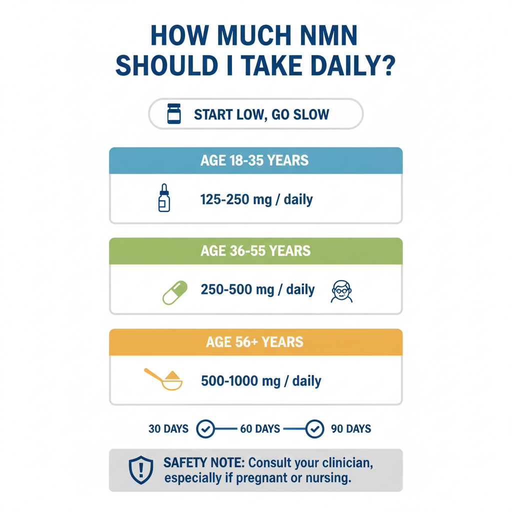 - prompt: “Vertical infographic for ‘how much nmn should i take daily’, palette #2B6CB0 / #2F855A / #D69E2E, flat icons, large readable labels, panels for age tiers, start-low reminder, 30/60/90 checkpoints, safety note, no people, WebP 1200×1800.”